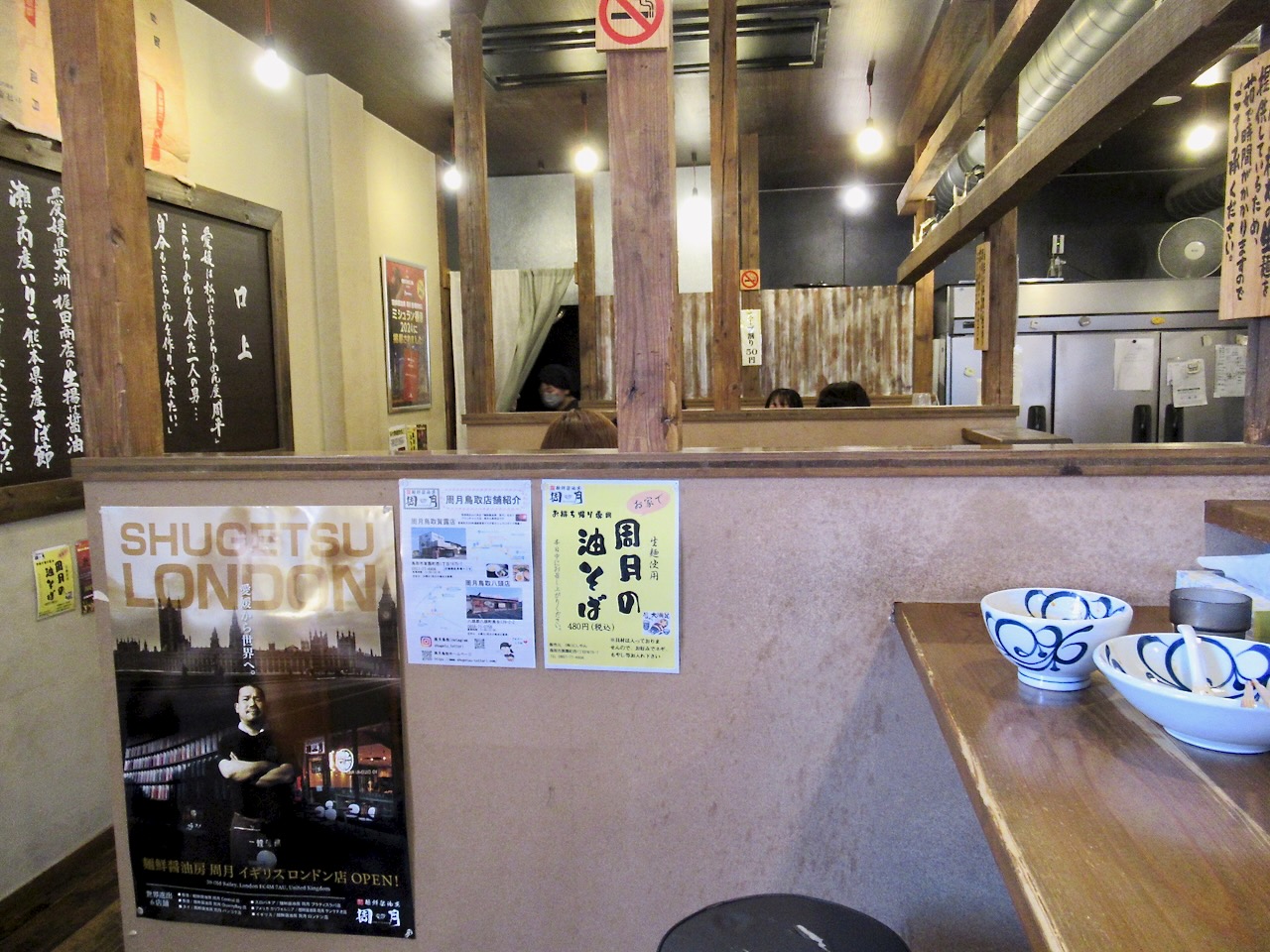 お店の雰囲気はこんな感じで、厨房を囲むようにカウンター席が広がり、一番奥にテーブル席が2つ並んでます。