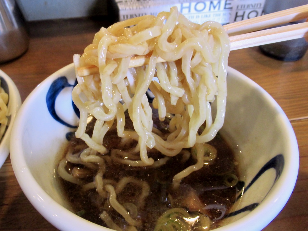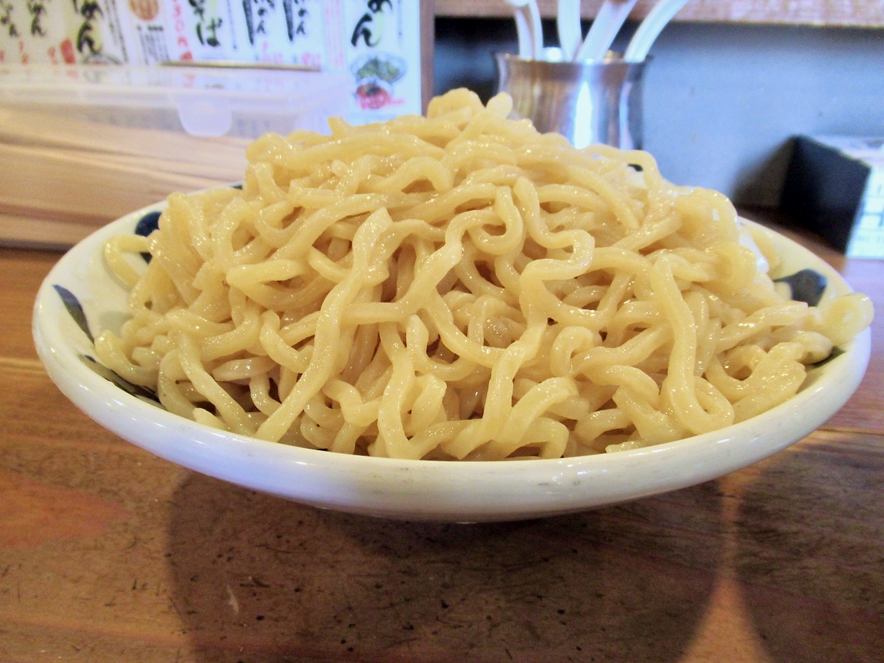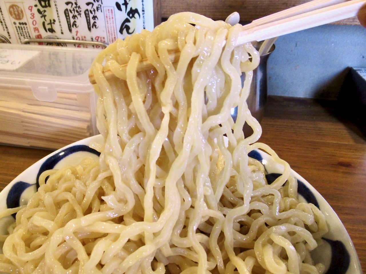 割り箸くらいの太さのちぢれ麺でモッチモチの麺です。