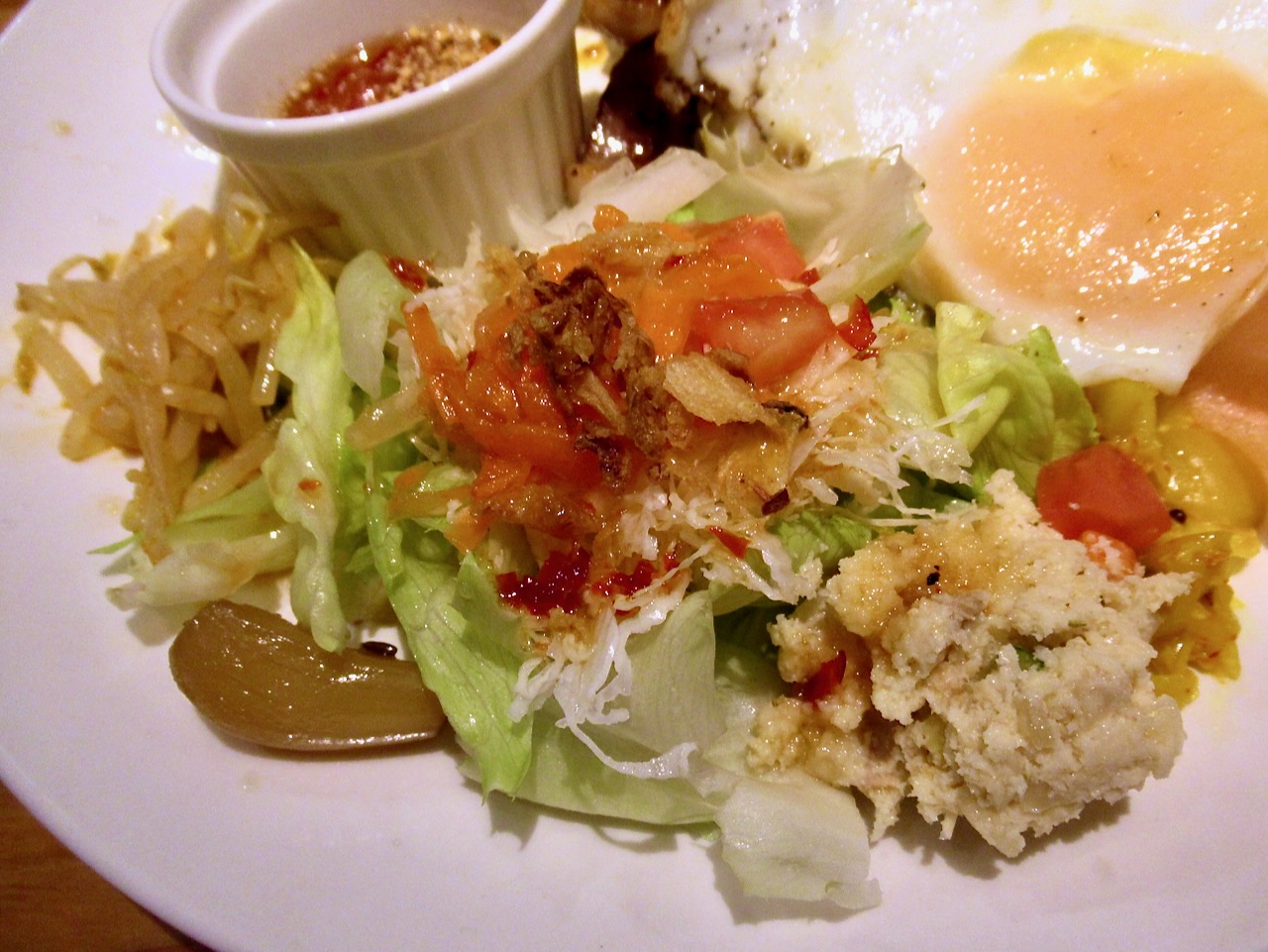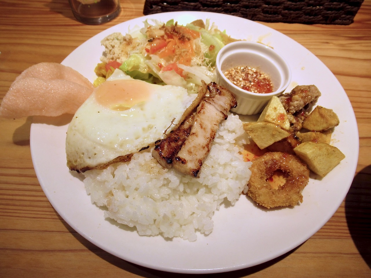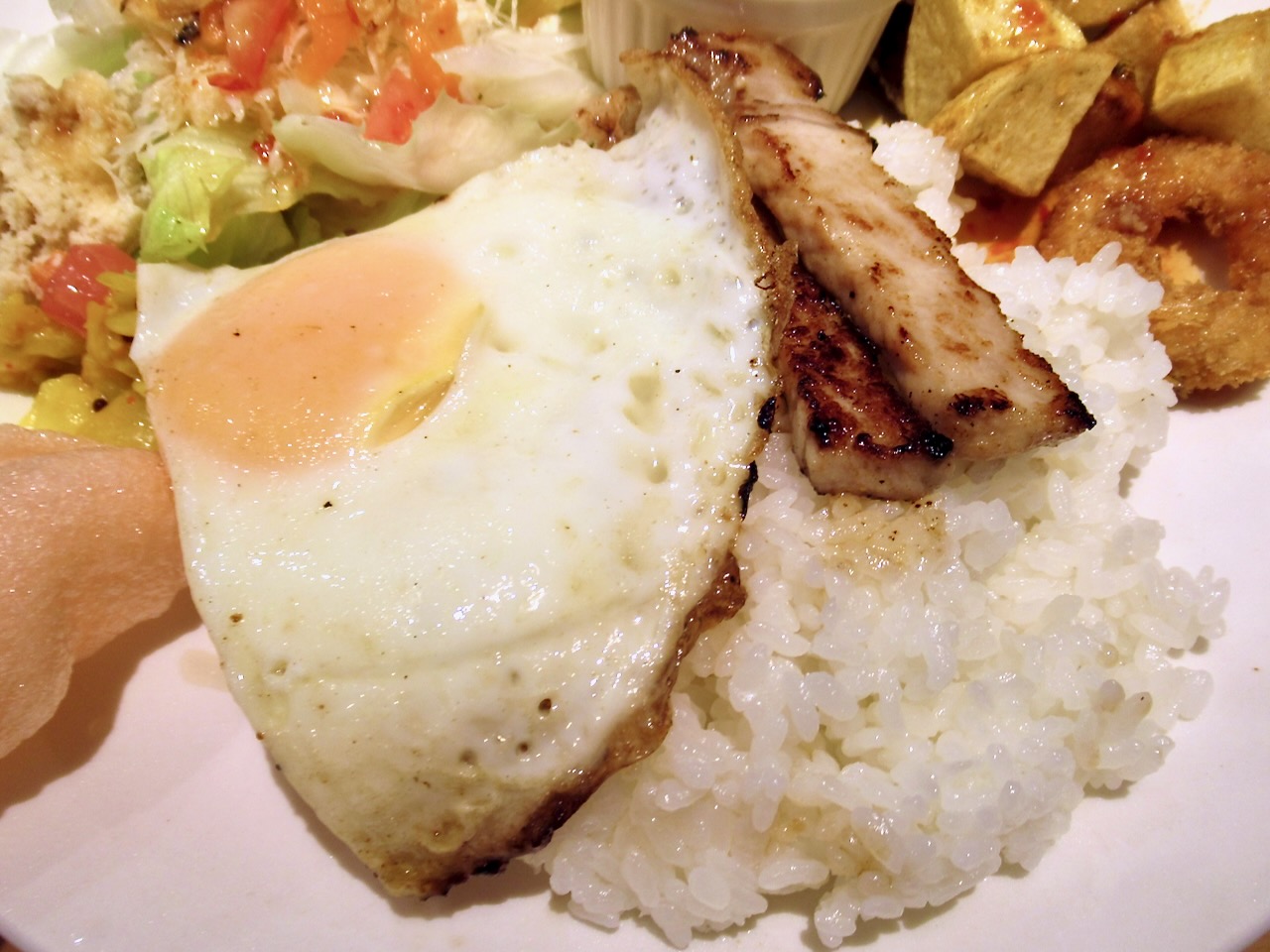 そしてご飯の上には目玉焼きと豚肩ロースのタイ風ステーキが美味しそうに盛られてます。