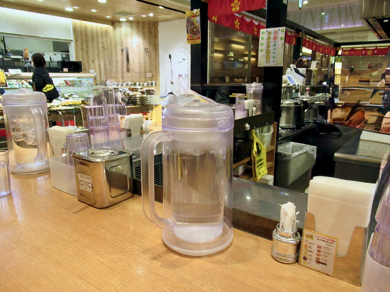 けうンター席がメインで、厨房を囲むようにこの字型に広がってます。