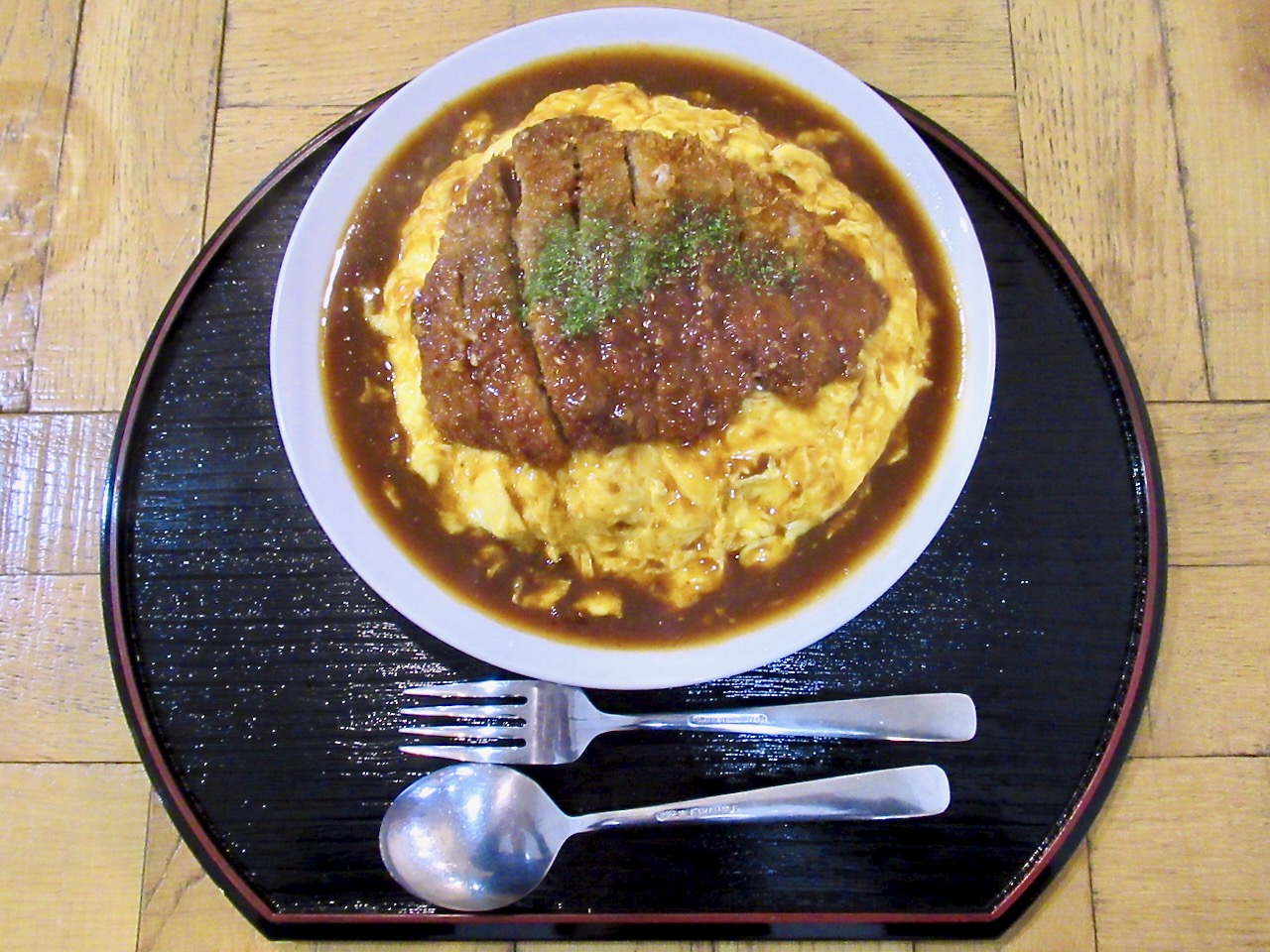 オムライスを覆い尽くすようなカツは迫力ありますね(^_^)