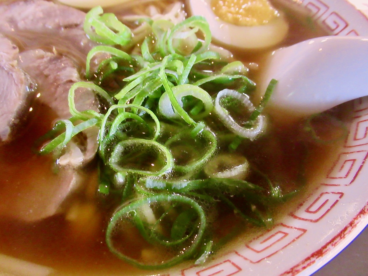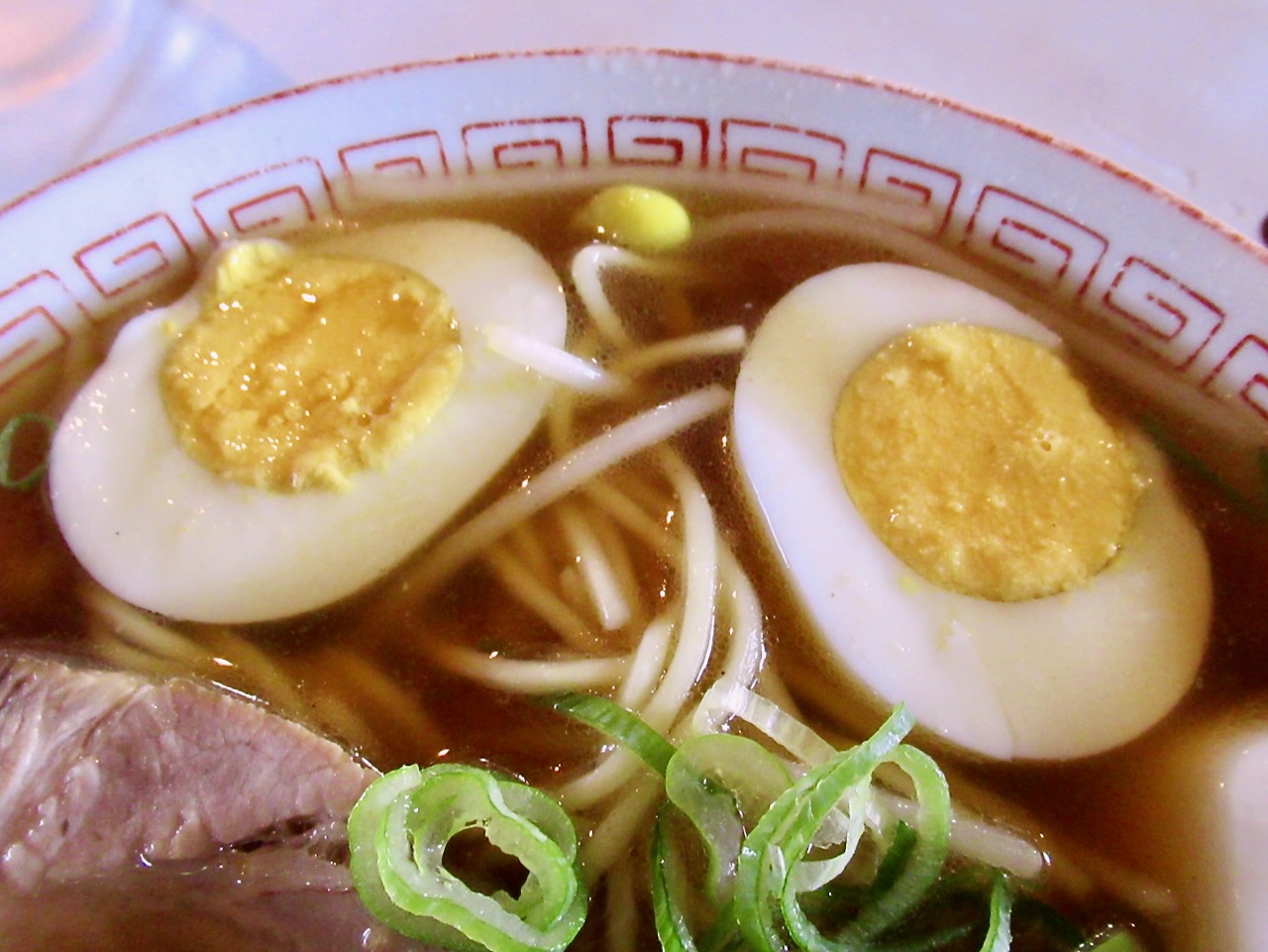 麺の上には半分に切ったゆで卵がまるまる1個分とたくさんのネギがトッピングされてます。