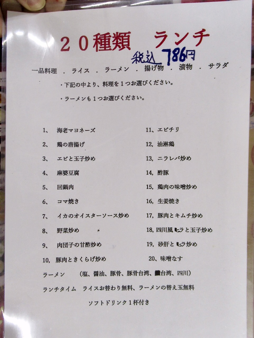 今回のランチは20種類の一品料理からおかずを選べて、それにラーメンや小鉢の揚げ物にライスと漬物にサラダがセットになったランチです。
